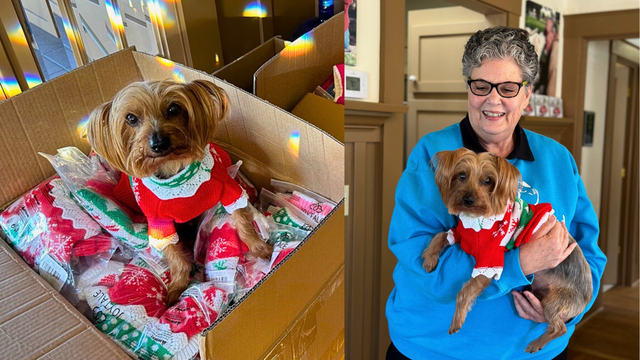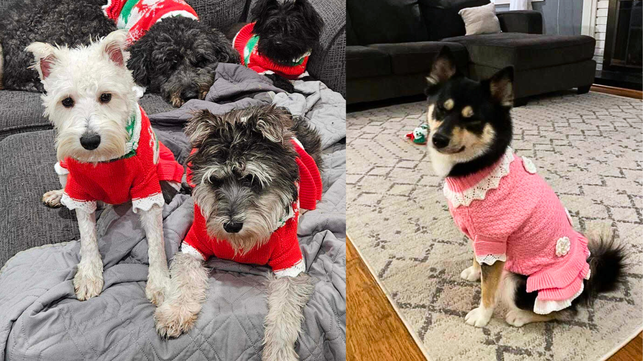"Wow, this is fantastic. Thank you so much! We received the shipment and love it. We will likely share some of the sweaters and other donations with some other local shelters. :) Our volunteer coordinator’s dog, Jack, is modeling one of the sweaters. Thanks again & Happy Holidays!"——Peace of Mind Dog Rescue