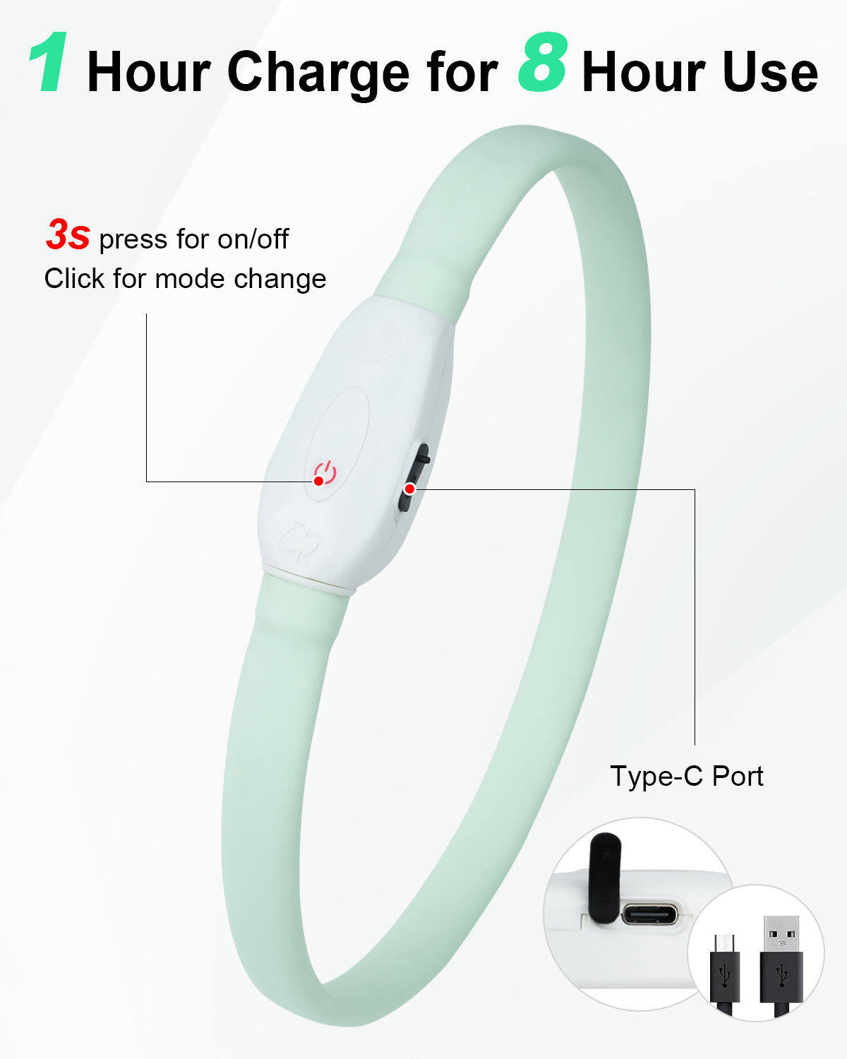 - Long-lasting Battery Life: Quick-charge your glow collar in just 1 hour for over 8 hours of continuous use. Equipped with a convenient Type-C charging port, it's ready for any outing.